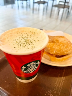 スタバの新作😍 トリュフスープチーノ💓 おいしすぎた!😳✨ トリュフの匂いすごいするしおしゃれなきのこスープって感じ!(っ ॑꒳ ॑c) 上のふわふわもクリーミーで好き☺️ ベーコンエッグチーズベーグルサンド一緒に頼んだんだけどパンがすごくもちもちでおいしかったよ😍 一緒がオススメദ്ദി ˃ ᵕ ˂ ) さ、おいしいもの食べたし今日もがんばろうっ✊✨